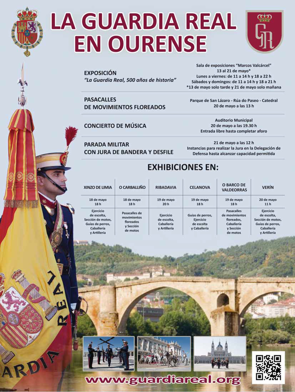 Entre o 18 e o 20 de maio, Verín será o escenario dun conxunto de exhibicións da Garda Real coa finalidade de dar a coñecer o seu labor -que non é outra que proporcionar o servizo de garda militar, render honras e dar escoltas solemnes á Familia Real- e doutra banda, poñer en práctica e desenvolver as técnicas e capacidades de mando e control, apoio loxístico e actividades tácticas de instrución e adestramento propias de toda unidade militar. |