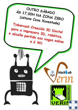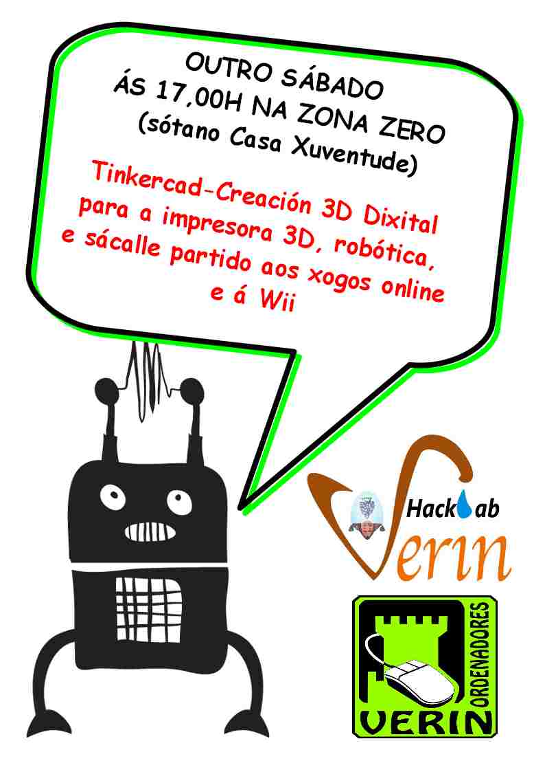 O próximo sábado 11 de xullo, as 17:00 horas, impartirase na 'Zona Zero', situada na Casa da Xuventude de Verín, o segundo “Obradoiro de Tinkercad-Creación 3D Dixital para impresoras 3d, robótica, e sácalle partido aos xogos online e á Wii”. O proxecto de dinamización xuvenil e infantil "zona zero", trátase dun espazo lúdico de encontro, debate, investigación e coñecemento da tecnoloxía. A través da realización de actividades e obradoiros de carácter social e tecnolóxico, os rapaces e rapazas poderán coñecerse, unir, socializar e potenciar as súas habilidades sociais; ademais de dispor un espazo de lecer onde divertirse e relacionarse cos/coas seus/súas iguais. |
